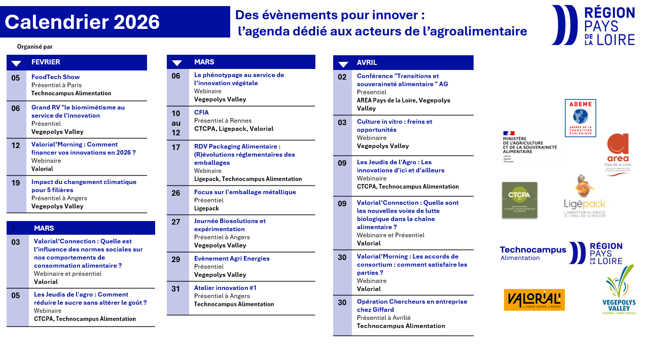 ADEME, AREA Pays de la Loire, CTCPA, DRAAF, Ligepack, Région des Pays de la Loire, Technocampus Alimentation, Valorial et Végépolys Valley s’appliquent à proposer collectivement des actions pour accompagner les entreprises dans leurs projets d’innovation.